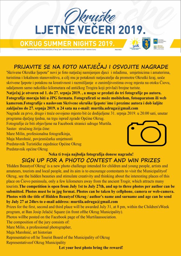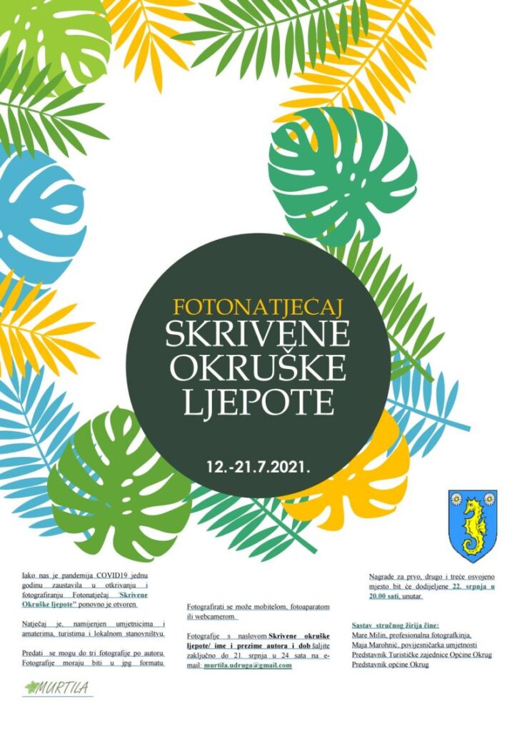 “Skrivene Okruške ljepote” je foto natječaj namijenjen djeci i mladima, umjetnicima i amaterima, turistima i lokalnom stanovništvu, a cilj mu je potaknuti natjecatelje da promotre Okruški kraj, uoče skrivene ljepote i potaknu na kreativnost i razmišljanje o zanimljivostima ovog mjesta na poluotoku Čiovu, udaljenom samo nekoliko kilometara od antičkog Trogira koji privlači brojne turiste.