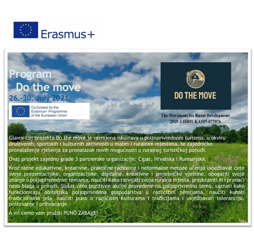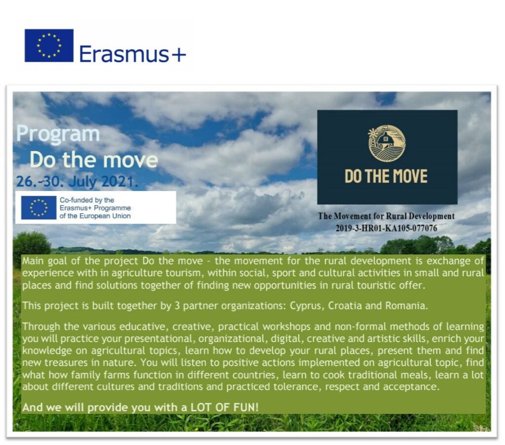 The Murtila Association is the holder of the Erasmus + project entitled Do the move - the movement for rural development (2019-3-HR01-KA105-077076) , which was designed by joint partners of three partners from three European countries: Cyprus, Romania and Croatia. The project was implemented in the Municipality of Dvor, Sisak-Moslavina County (from 26 to 30 July 2021) and Paphos, Cyprus (from 23 to 27 September 2021)
